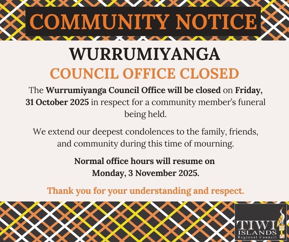 The Wurrumiyanga Council Office will be closed on Friday, 31 October 2025 in respect for a community member’s funeral being held.