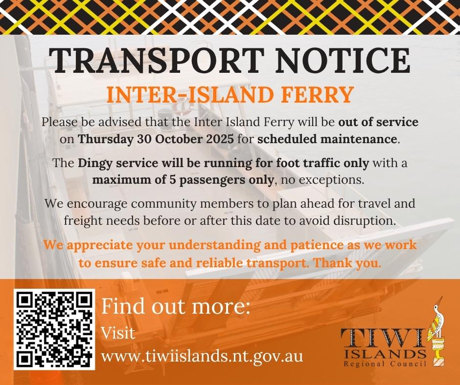 Please be advised that the Inter-Island Ferry will be out of service on Thursday, 30 October 2025 for scheduled maintenance.