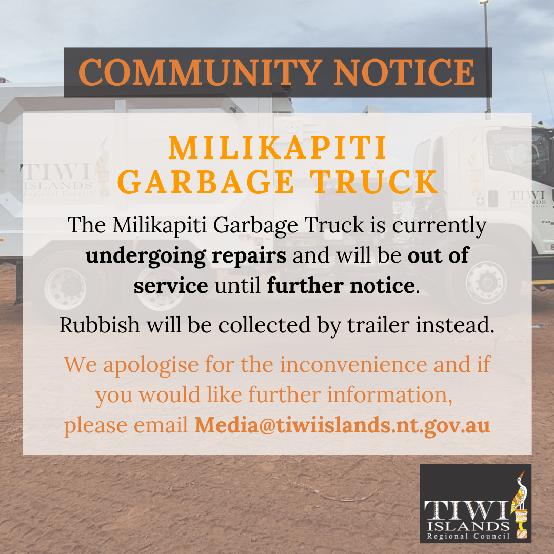 The Milikapiti Garbage Truck is currently undergoing repairs and will be out of service until further notice. To ensure waste collection continues, rubbish will be collected by trailer during this time. Status: Service modified (collection by trailer). We apologise for the inconvenience and appreciate the community’s patience while repairs are completed. More information Email: Media@tiwiislands.nt.gov.au