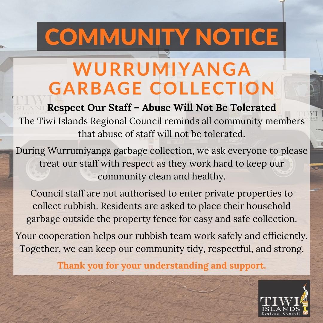 During Wurrumiyanga garbage collection, we ask everyone to please treat our staff with respect as they work hard to keep our community clean and healthy.