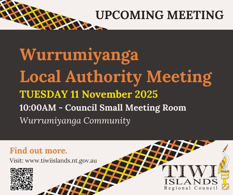 The Wurrumiyanga Local Authority Meeting will be held on Tuesday, 11 November 2025 at the Council Small Meeting Room.